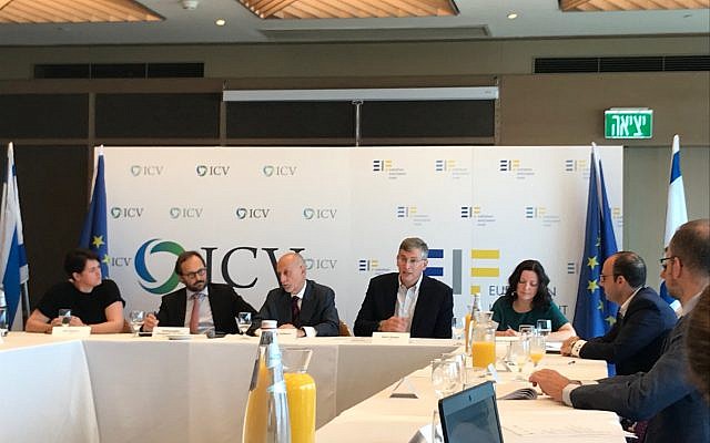 Pier Luigi Gilbert, the chief executive of the European Investment Fund, center, together with Meir Ukeles, to his right, a partner at ICV at a press conference in Tel Aviv on Sept. 13, 2018 (Shoshanna Solomon/Times of Israel)