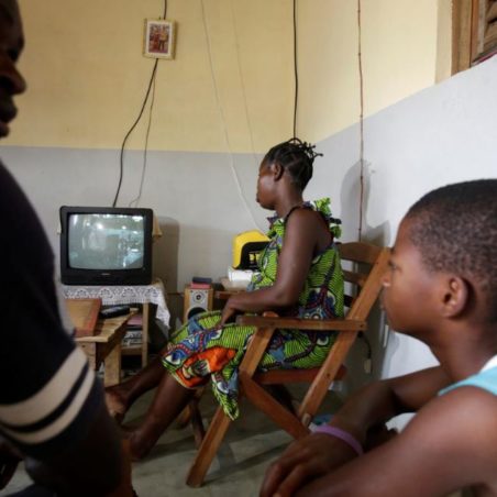 Jean-Noel Kouame, 31, sits with his family as they watch television inside their house, on the outer limits of the main city Abidjan’s vast urban sprawl, Ivory Coast December 18, 2017. REUTERS/Thierry Gouegnon